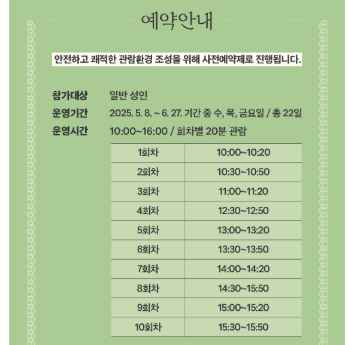 | 관람 정원 | 회차별 15명 |